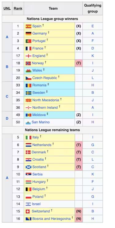 根据目前的递补顺位,圣马力诺恰好排在罗马尼亚之后,是第一支无法获得递补资格的球队。因此,圣马力诺的唯一希望就是罗马尼亚能够通过世界杯预选赛的常规途径(获得小组第一或第二)晋级,从而将他们的欧国联递补名额空出。