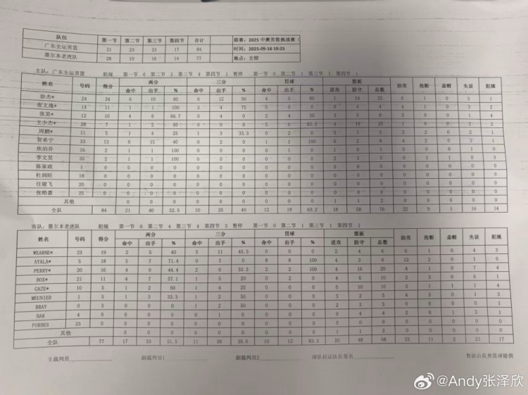 比赛结束后,媒体人@Andy张泽欣 在社媒上晒出了一张本场比赛的数据统计,这是一张离谱的统计表,其中显示,广东男篮58个后场篮板,而表中其它数据又显示墨尔本老虎队今天一共打了43铁(两分16铁,三分25铁,罚球2铁)????。