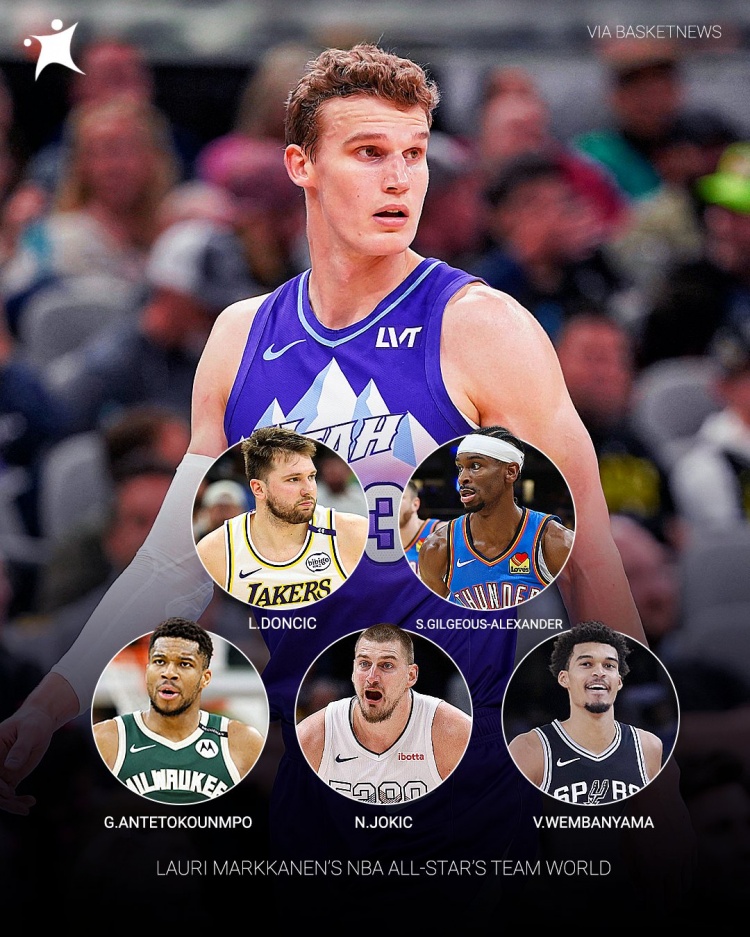 马尔卡宁的全明星世界队先发:SGA+东契奇+字母哥+文班+约老师