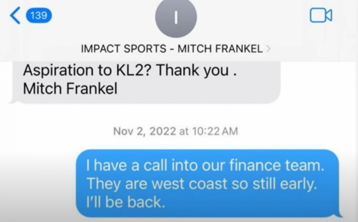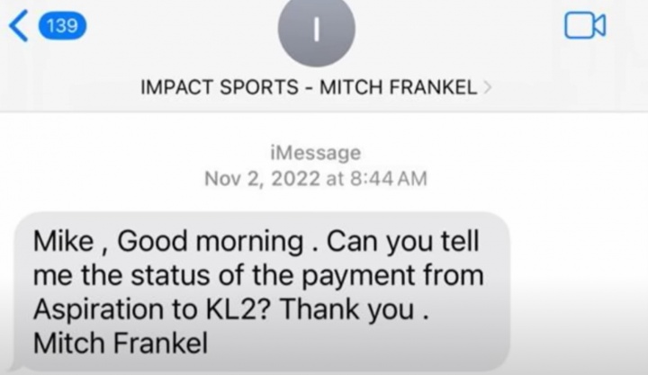Torre晒出了几段手机短信截图,内容是莱昂纳德经纪人米奇-弗兰克尔向Aspiration公司的法律顾问了解给莱昂纳德付款的情况。这意味着莱昂纳德存在场外虚假代言的阴阳合同一事,并非莱昂纳德舅舅丹尼斯-罗伯森一人所为,莱昂纳德经纪人也了解其中的情况。弗兰克尔是莱昂纳德团队里真正的持证、注册、认证经纪人。
