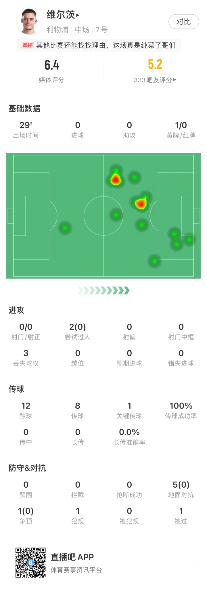 维尔茨今夏以1.36亿欧总价加盟利物浦,加盟至今首发出战7场,但仅贡献1次助攻,还未收获自己红军生涯的首粒进球。